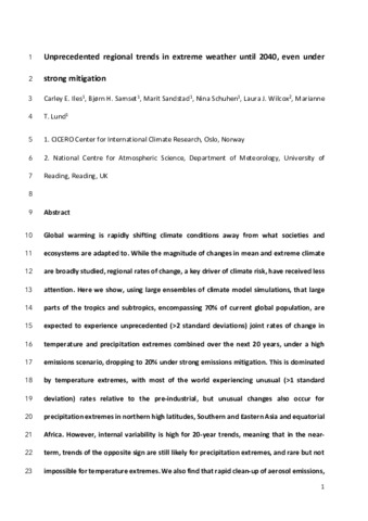 Iles, C. E., Samset, B. H., Sandstad, M., Schuhen, N., Wilcox, L. J. orcid id iconORCID: https://orcid.org/0000-0001-5691-1493 and Lund, M. T. (2024) Strong regional trends in extreme weather over the next two decades under high- and low-emissions pathways. Nature Geoscience, 17. pp. 845-850. ISSN 1752-0908 doi: 10.1038/s41561-024-01511-4