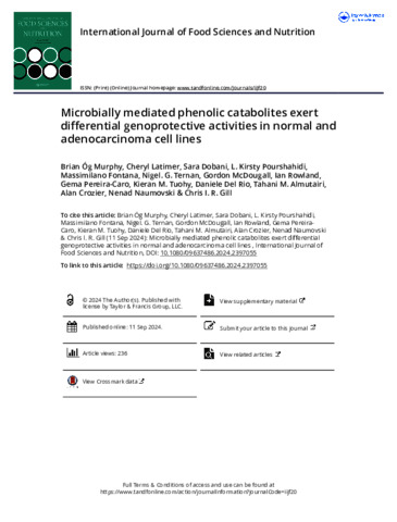 Murphy, B. Ó., Latimer, C., Dobani, S., Pourshahidi, L. K., Fontana, M., Ternan, N. G., McDougall, G., Rowland, I., Pereira-Caro, G., Tuohy, K. M., Del Rio, D., Almutairi, T. M., Crozier, A., Naumovski, N. and Gill, C. I. R. (2024) Microbially mediated phenolic catabolites exert differential genoprotective activities in normal and adenocarcinoma cell lines. International Journal of Food Sciences and Nutrition. ISSN 1465-3478 doi: 10.1080/09637486.2024.2397055