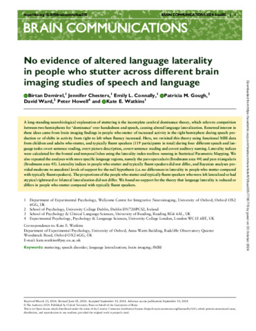 No evidence of altered language laterality in people who stutter across different brain imaging studies of speech and language.