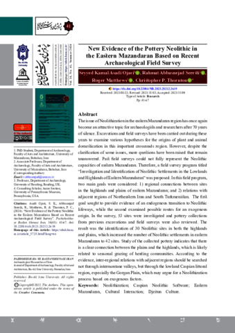 The issue of Neolithization in the eastern Mazandaran region has once again become an attractive topic for archaeologists and researchers after 70 years of silence. Excavations and field surveys have been carried out during these years to examine various hypotheses for the origins of plant and animal domestication in this important crossroads region. However, despite the clarification of some issues, more questions have been raised that remain unanswered. Past field surveys could not fully represent the Neolithic capacities of eastern Mazandaran. Therefore, a field survey program titled “Investigation and Identification of Neolithic Settlements in the Lowlands and Highlands of Eastern Mazandaran” was proposed. In this field program, two main goals were considered: 1) regional connections between sites in the highlands and plains of eastern Mazandaran; and 2) relations with adjacent regions of Northeastern Iran and South Turkmenistan. The first goal sought to provide evidence of an endogenous transition to Neolithic lifeways, while the second examined possible routes for an exogenous origin. In the survey, 53 sites were investigated and pottery collections from previous excavations and field surveys were also reviewed. The result was the identification of 30 Neolithic sites in both the highlands and plains, which increased the number of Neolithic settlements in eastern Mazandaran to 42 sites. Study of the collected pottery indicates that there is a clear connection between the plains and the highlands, which is likely related to seasonal grazing of herding communities. According to the evidence, inter-regional relations with adjacent regions should be searched not through intermontane valleys, but through the lowland Caspian littoral region, especially the Gorgan Plain, which may argue for a Neolithization process based on exogenous factors.