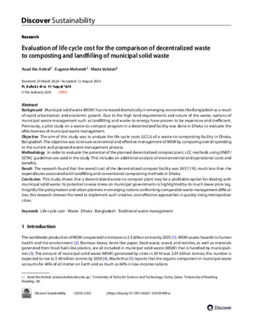 Background Municipal solid waste (MSW) has increased dramatically in emerging economies like Bangladesh as a result of rapid urbanization and economic growth. Due to the high land requirements and nature of the waste, options of municipal waste management such as landfilling and waste-to-energy have proven to be expensive and inefficient. Previously, a pilot study on a waste-to-compost program in a decentralized facility was done in Dhaka to evaluate the effectiveness of municipal waste management. Objective The aim of this study was to analyze the life cycle costs (LCCs) of a waste-to-composting facility in Dhaka, Bangladesh. The objective was to ensure economical and effective management of MSW by comparing overall spending to the current and proposed waste management process. Methodology In order to evaluate the potential of the planned decentralized compost plant, LCC methods using UNEP/SETAC guidelines are used in the study. This includes an additional analysis of environmental and operational costs and benefits. Result The research found that the overall cost of the decentralized compost facility was $857,110, much less than the expenditures associated with landfilling and conventional composting methods in Dhaka. Conclusion This study shows that a decentralized waste-to-compost plant may be a profitable option for dealing with municipal solid waste. Its potential to ease stress on municipal governments is highlighted by its much lower price tag. Insightful for policymakers and urban planners in emerging nations confronting comparable waste management difficulties, this research stresses the need to implement such creative, cost-effective approaches in quickly rising metropolitan cities.