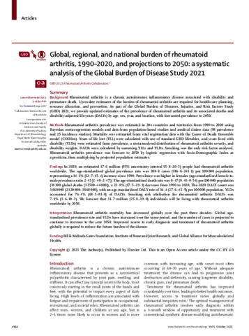 Black, R. J., Cross, M., Haile, L. M., Culbreth, G. T., Steinmetz, J. D., Hagins, H., Kopec, J. A., Brooks, P. M., Woolf, A. D., Ong, K. L., Kopansky-Giles, D. R., Dreinhoefer, K. E., Betteridge, N., Aali, A., Abbasifard, M., Abbasi-Kangevari, M., Abdurehman, A. M., Abedi, A., Abidi, H., Aboagye, R. G., Abolhassani, H., Abu-Gharbieh, E., Abu-Zaid, A., Adamu, K., Addo, I. Y., Adesina, M. A., Adnani, Q. E. S., Afzal, M. S., Ahmed, A., Aithala, J. P., Akhlaghdoust, M., Alemayehu, A., Alvand, S., Alvis-Zakzuk, N. J., Amu, H., Antony, B., Arabloo, J., Aravkin, A. Y., Arulappan, J., Ashraf, T., Athari, S. S., Azadnajafabad, S., Badawi, A., Baghcheghi, N., Baig, A. A., Balta, A. B., Banach, M., Banik, P. C., Barrow, A., Bashiri, A., Bearne, L. M., Bekele, A., Bensenor, I. M., Berhie, A. Y., Bhagavathula, A. S., Bhardwaj, P., Bhat, A. N., Bhojaraja, V. S., Bitaraf, S., Bodicha, B. B. A., Botelho, J. S., Briggs, A. M., Buchbinder, R., Castañeda-Orjuela, C. A., Charalampous, P., Chattu, V. K., Coberly, K., Cruz-Martins, N., Dadras, O., Dai, X., de Luca, K., Dessalegn, F. N., Dessie, G., Dhimal, M., Digesa, L. E., Diress, M., Doku, P. N., Edinur, H. A., Ekholuenetale, M., Elhadi, M., El-Sherbiny, Y. M., Etaee, F., Ezzeddini, R., Faghani, S., Filip, I., Fischer, F., Fukumoto, T., Ganesan, B., Gebremichael, M. A., Gerema, U., Getachew, M. E., Ghashghaee, A., Gill, T. K., Gupta, B., Gupta, S., Gupta, V. B., Gupta, V. K., Halwani, R., Hannan, M. A., Haque, S., Harlianto, N. I., Harorani, M., Hasaballah, A. I., Hassen, M. B., Hay, S. I., Hayat, K., Heidari, G., Hezam, K., Hill, C. L., Hiraike, Y., Horita, N., Hoveidaei, A. H., Hsiao, A. K., Hsieh, E., Hussain, S., Iavicoli, I., Ilic, I. M., Islam, S. M. S., Ismail, N. E., Iwagami, M., Jakovljevic, M., Jani, C. T., Jeganathan, J., Joseph, N., Kadashetti, V., Kandel, H., Kanko, T. K., Karaye, I. M., Khajuria, H., Khan, M. J., Khan, M. A., Khanali, J., Khatatbeh, M. M., Khubchandani, J., Kim, Y. J., Kisa, A., Kolahi, A.-A., Kompani, F., Koohestani, H. R., Koyanagi, A., Krishan, K., Kuddus, M., Kumar, N., Kuttikkattu, A., Larijani, B., Lim, S. S., Lo, J., Machado, V. S., Mahajan, P. B., Majeed, A., Malakan Rad, E., Malik, A. A., Mansournia, M. A., Mathews, E., Mendes, J. J., Mentis, A.-F. A., Mesregah, M. K., Mestrovic, T., Mirghaderi, S. P., Mirrakhimov, E. M., Misganaw, A., Mohamadkhani, A., Mohammed, S., Mokdad, A. H., Moniruzzaman, M., Montasir, A. A., Mulu, G. B., Murillo-Zamora, E., Murray, C. J. L., Mustafa, G., Naghavi, M., Nair, T. S., Naqvi, A. A. orcid id iconORCID: https://orcid.org/0000-0003-2637-0424, Natto, Z. S., Nayak, B. P., Neupane, S., Nguyen, C. T., Niazi, R. K., Nzoputam, O. J., Oh, I.-H., Okati-Aliabad, H., Okonji, O. C., Olufadewa, I. I., Owolabi, M. O., Pacheco-Barrios, K., Padubidri, J. R., Patel, J., Pathan, A. R., Pawar, S., Pedersini, P., Perianayagam, A., Petcu, I.-R., Qattea, I., Radfar, A., Rafiei, A., Rahman, M. H. U., Rahmanian, V., Rashedi, V., Rashidi, M.-M., Ratan, Z. A., Rawaf, S., Razeghinia, M. S., Redwan, E. M. M., Renzaho, A. M. N., Rezaei, N., Rezaei, N., Riad, A., Saad, A. M. A., Saddik, B., Saeed, U., Safary, A., Sahebazzamani, M., Sahebkar, A., Sahoo, H., Salek Farrokhi, A., Saqib, M. A. N., Seylani, A., Shahabi, S., Shaikh, M. A., Shashamo, B. B., Shetty, A., Shetty, J. K., Shigematsu, M., Shivarov, V., Shobeiri, P., Sibhat, M. M., Sinaei, E., Singh, A., Singh, J. A., Singh, P., Singh, S., Siraj, M. S., Skryabina, A. A., Slater, H., Smith, A. E., Solomon, Y., Soltani-Zangbar, M. S., Tabish, M., Tan, K.-K., Tat, N. Y., Tehrani-Banihashemi, A., Tharwat, S., Tovani-Palone, M. R., Tusa, B. S., Valadan Tahbaz, S., Valdez, P. R., Valizadeh, R., Vaziri, S., Vollset, S. E., Wu, A.-M., Yada, D. Y., Yehualashet, S. S., Yonemoto, N., You, Y., Yunusa, I., Zangiabadian, M., Zare, I., Zarrintan, A., Zhang, Z.-J., Zhong, C., Zoladl, M., Vos, T. and March, L. M. (2023) Global, regional, and national burden of rheumatoid arthritis, 1990–2020, and projections to 2050: a systematic analysis of the Global Burden of Disease Study 2021. The Lancet Rheumatology, 5 (10). e594-e610. ISSN 2665-9913 doi: 10.1016/S2665-9913(23)00211-4