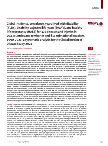 Global incidence, prevalence, years lived with disability (YLDs), disability-adjusted life-years (DALYs), and healthy life expectancy (HALE) for 371 diseases and injuries in 204 countries and territories and 811 subnational locations, 1990–2021: a systematic analysis for the Global Burden of Disease Study 2021.