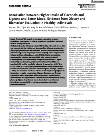 Ma, X., Xu, Y., Li, Y., Gibson, R., Williams, C. orcid id iconORCID: https://orcid.org/0000-0003-4452-671X, Lawrence, A. J., Nosarti, C., Dazzan, P. and Rodriguez-Mateos, A. (2024) Association between higher intake of flavonols and lignans and better mood: evidence from dietary and biomarker evaluation in healthy individuals. Molecular Nutrition & Food Research. ISSN 1613-4125 doi: 10.1002/mnfr.202400112