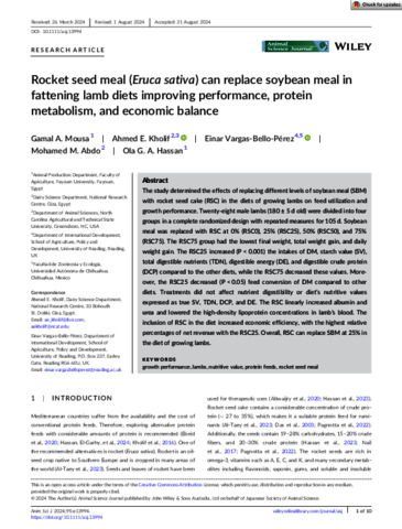 Mousa, G. A., Kholif, A. E. orcid id iconORCID: https://orcid.org/0000-0003-0472-4770, Vargas-Bello-Pérez, E. orcid id iconORCID: https://orcid.org/0000-0001-7105-5752, Abdo, M. M. and Hassan, O. G. A. (2024) Rocket seed meal (Eruca sativa) can replace soybean meal in fattening lamb diets improving performance, protein metabolism, and economic balance. Animal Science Journal, 95 (1). ISSN 1740-0929 doi: 10.1111/asj.13994