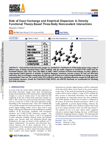 Role of exact exchange and empirical dispersion in density functional theory-based three-body noncovalent interactions.