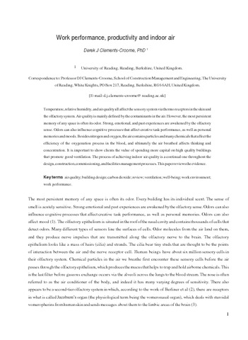 Clements-Croome, D. J. (2008) Work performance, productivity and indoor air. Scandinavian Journal of Work Environment & Health (Supplement). pp. 69-78. ISSN 0355-3140