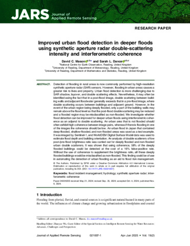 Improved urban flood detection in deeper floods using synthetic aperture radar double-scattering intensity and interferometric coherence.