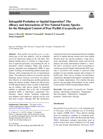 Intraguild predation or spatial separation? the efficacy and interactions of two natural enemy species for the biological control of Pear Psyllid (Cacopsylla pyri).