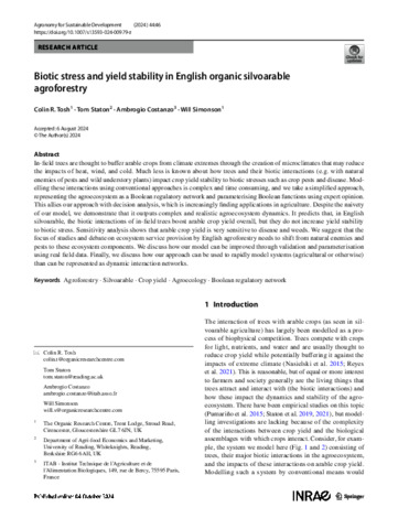 Tosh, C. R., Staton, T. orcid id iconORCID: https://orcid.org/0000-0003-0597-0121, Costanzo, A. and Simonson, W. (2024) Biotic stress and yield stability in English organic silvoarable agroforestry. Agronomy for Sustainable Development, 44. 46. ISSN 1773-0155 doi: 10.1007/s13593-024-00979-z