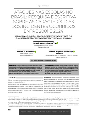Utilizando um protocolo de coleta de dados de fontes abertas, o artigo examina as características dos ataques em escolas no Brasil entre 2001 e 2024, discutindo semelhanças e diferenças com outros eventos internacionais. A pesquisa ressalta a importância de estudar os ataques nas escolas como uma forma distinta de violência.