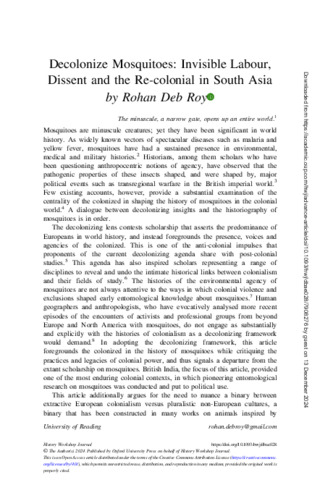 This article contributes to a dialogue between current decolonizing insights and the history of insects. It focusses on mosquitoes— miniscule vectors of spectacular diseases. Whilst foregrounding the prominence of the colonized in shaping the history of mosquitoes in South Asia, this article combines three distinct lines of decolonizing scholarship that are usually pursued independently of one another: critique of colonial knowledge; examination of anticolonial articulations of the colonized; exposé of how the post-colonial state inherits and reinforces atrocious colonial precedents. It enables the current decolonizing agenda to offer a critique of state power across chronological periods and political regimes.