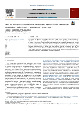 We examine the effects of universal free school meal (UFSM) policies on school attendance and healthrelated absences. We leverage UFSM implementation in Scotland where all pupils in the first three grades of primary schools became automatically entitled to claim free meals, regardless of their households’ financial circumstances. We estimate a difference-in-differences model with variation in schoollevel exposure to the policy and find that, in spite of a large increase in take-up rates, attendance did not improve. Using an alternative exposure measure that includes those pupils switching from paid to free school meals, we find small positive and negative effects on attendance and health-related absences respectively. These findings would suggest the presence of a channel whereby financial savings by families encourage attendance, but these effects are too small to be considered economically meaningful.