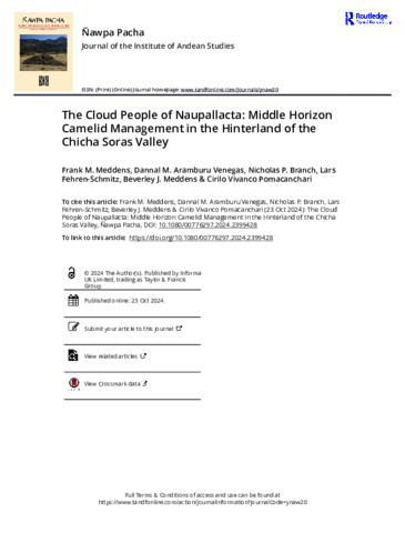 Meddens, F. M., Aramburu Venegas, D. M., Branch, N. P. orcid id iconORCID: https://orcid.org/0000-0001-8826-0365, Fehren-Schmitz, L., Meddens, B. J. and Vivanco Pomacanchari, C. (2024) The cloud people of Naupallacta: Middle Horizon Camelid management in the hinterland of the Chicha Soras Valley. Ñawpa Pacha Journal of the Institute of Andean Studies. ISSN 0077-6297 doi: 10.1080/00776297.2024.2399428