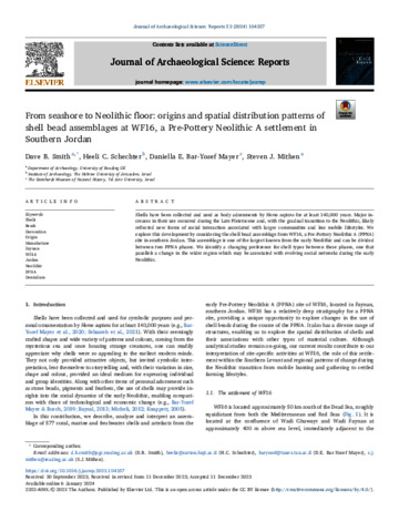 Smith, D. B. orcid id iconORCID: https://orcid.org/0009-0000-0616-6309, Schechter, H. C., Bar-Yosef Mayer, D. E. and Mithen, S. J. orcid id iconORCID: https://orcid.org/0000-0002-3391-7443 (2024) From seashore to Neolithic floor: origins and spatial distribution patterns of shell bead assemblages at WF16, a Pre-Pottery Neolithic A settlement in Southern Jordan. Journal of Archaeological Science: Reports, 53. 104357. ISSN 2352-4103 doi: 10.1016/j.jasrep.2023.104357