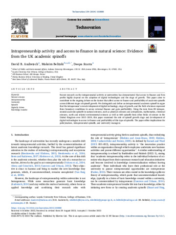 Audretsch, D. B., Belitski, M. orcid id iconORCID: https://orcid.org/0000-0002-9895-0105 and Scarra, D. (2024) Intrapreneurship activity and access to finance in natural science: evidence from the UK academic spinoffs. Technovation, 129. 102888. ISSN 1879-2383 doi: 10.1016/j.technovation.2023.102888
