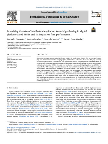 Chatterjee, S., Chaudhuri, R., Mariani, M. orcid id iconORCID: https://orcid.org/0000-0002-7916-2576 and Fosso Wamba, S. orcid id iconORCID: https://orcid.org/0000-0002-1073-058X (2023) Examining the role of intellectual capital on knowledge sharing in digital platform-based MNEs and its impact on firm performance. Technological Forecasting and Social Change, 197. 122909. ISSN 1873-5509 doi: 10.1016/j.techfore.2023.122909