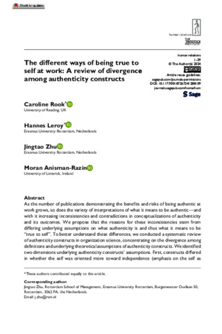 As the number of publications demonstrating the benefits and risks of being authentic at work grows, so does the variety of interpretations of what it means to be authentic—and with it increasing inconsistencies and contradictions in conceptualizations of authenticity and its outcomes. We propose that the reasons for these inconsistencies stem from differing underlying assumptions on what authenticity is and thus what it means to be “true to self”. To better understand these differences, we conducted a systematic review of authenticity constructs in organization science, concentrating on the divergence among definitions and underlying theoretical assumptions of authenticity constructs. We identified two dimensions underlying authenticity constructs’ assumptions. First, constructs differed in whether the self was oriented more toward independence (emphasis on the self as distinct from others) or toward interdependence (self as relationally oriented). Second, constructs ranged in their perspectives on the self as fixed (self as stable) to more malleable (self as changing). In this review, we delineate the different ways of “staying true to one’s self” at work and show the inherent complexities in the process of being authentic in the workplace, explaining how these differences may lead to seemingly contradictory work-related outcomes of authenticity.