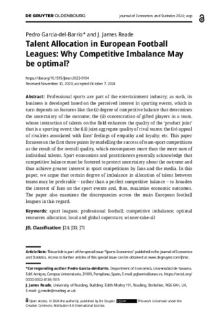 Garcia-del-Barrio, P. orcid id iconORCID: https://orcid.org/0000-0002-8136-1515 and Reade, J. J. orcid id iconORCID: https://orcid.org/0000-0002-8610-530X (2024) Talent allocation in European football leagues: why competitive imbalance may be optimal? Jahrbücher für Nationalökonomie und Statistik. ISSN 2366-049X doi: 10.1515/jbnst-2023-0104