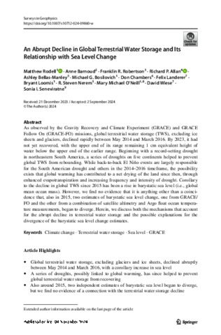 Rodell, M. orcid id iconORCID: https://orcid.org/0000-0003-0106-7437, Barnoud, A., Robertson, F. R., Allan, R. P. orcid id iconORCID: https://orcid.org/0000-0003-0264-9447, Bellas-Manley, A., Bosilovich, M. G., Chambers, D., Landerer, F., Loomis, B., Nerem, R. S., O’Neill, M. M., Wiese, D. and Seneviratne, S. I. (2024) An abrupt decline in global terrestrial water storage and its relationship with sea level change. Surveys in Geophysics. ISSN 1573-0956 doi: 10.1007/s10712-024-09860-w