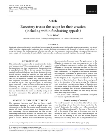 Wilde, D. (2024) Executory trusts: the scope for their creation (including within fundraising appeals). Trusts & Trustees, 30 (8). pp. 488-495. ISSN 1752-2110 doi: 10.1093/tandt/ttae059
