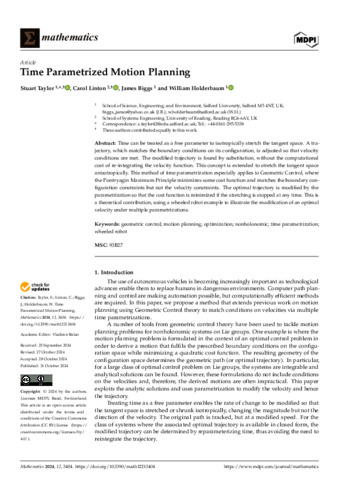 Taylor, S. orcid id iconORCID: https://orcid.org/0009-0009-3408-340X, Linton, C. orcid id iconORCID: https://orcid.org/0000-0002-9900-7274, Biggs, J. and Holderbaum, W. orcid id iconORCID: https://orcid.org/0000-0002-1677-9624 (2024) Time parametrized motion planning. Mathematics, 12 (21). 3404. ISSN 2227-7390 doi: 10.3390/math12213404