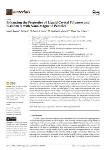 Reeves, S. J., Patel, D. orcid id iconORCID: https://orcid.org/0000-0001-5147-3391, Harris, P. J. F. orcid id iconORCID: https://orcid.org/0000-0003-1598-9686, Mitchell, G. R. orcid id iconORCID: https://orcid.org/0000-0001-7977-7610 and Davis, F. J. orcid id iconORCID: https://orcid.org/0000-0003-0462-872X (2024) Enhancing the properties of liquid crystal polymers and elastomers with nano magnetic particles. Materials, 17 (21). 5273. ISSN 1996-1944 doi: 10.3390/ma17215273
