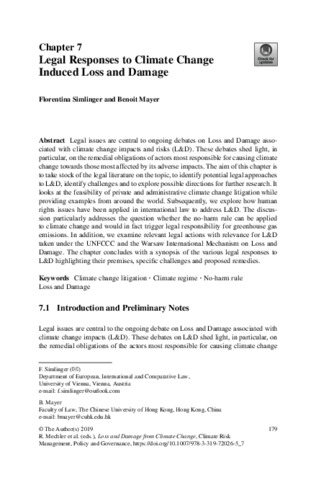 Legal issues are central to ongoing debates on Loss and Damage associated with climate change impacts and risks (L&D). These debates shed light, in particular, on the remedial obligations of actors most responsible for causing climate change towards those most affected by its adverse impacts. The aim of this chapter is to take stock of the legal literature on the topic, to identify potential legal approaches to L&D, identify challenges and to explore possible directions for further research. It looks at the feasibility of private and administrative climate change litigation while providing examples from around the world. Subsequently, we explore how human rights issues have been applied in international law to address L&D. The discussion particularly addresses the question whether the no-harm rule can be applied to climate change and would in fact trigger legal responsibility for greenhouse gas emissions. In addition, we examine relevant legal actions with relevance for L&D taken under the UNFCCC and the Warsaw International Mechanism on Loss and Damage. The chapter concludes with a synopsis of the various legal responses to L&D highlighting their premises, specific challenges and proposed remedies.