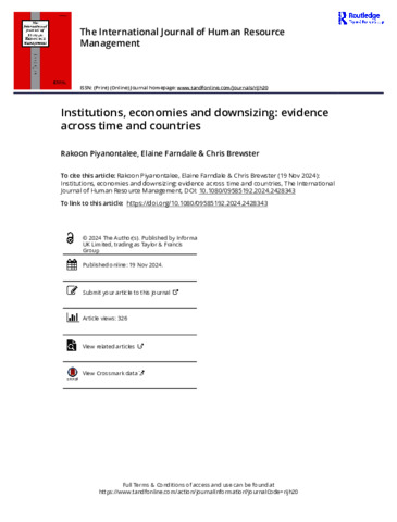 Piyanontalee, R., Farndale, E. and Brewster, C. orcid id iconORCID: https://orcid.org/0000-0001-5314-1518 (2024) Institutions, economies and downsizing: evidence across time and countries. The International Journal of Human Resource Management. ISSN 1466-4399 doi: 10.1080/09585192.2024.2428343