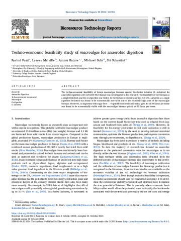 Paul, R., Melville, L., Bature, A. orcid id iconORCID: https://orcid.org/0000-0003-0544-7322, Sulu, M. and Suhartini, S. (2024) Techno-economic feasibility study of macroalgae for anaerobic digestion. Bioresource Technology Reports, 28. 101984. ISSN 2589-014X doi: 10.1016/j.biteb.2024.101984