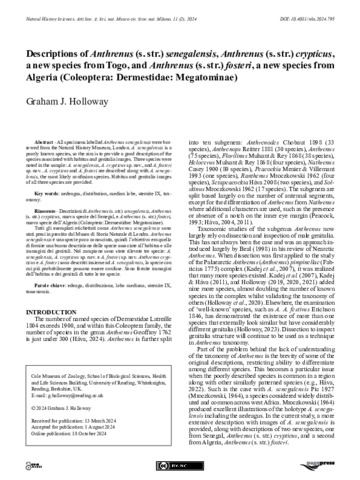Holloway, G. J. (2024) Descriptions of Anthrenus (s. str.) senegalensis, Anthrenus (s. str.) crypticus, a new species from Togo, and Anthrenus (s. str.) fosteri, a new species from Algeria (Coleoptera: Dermestidae: Megatominae). Natural History Sciences, 11 (2). pp. 28-35. ISSN 2385-0922 doi: 10.4081/nhs.2024.795