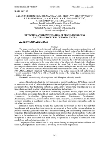Zhuniszhan, A. Z., Berzhanova, R. Z., Abay, G. K., Khutoryansky, V. V. orcid id iconORCID: https://orcid.org/0000-0002-7221-2630, Rakhmetova, T. T., Mukash, A. A., Zhumagalikyzy, A., Kumargazhinova, A. A., Seksenbayev, A. and Mukasheva, T. D. (2024) Detection and identification of mucus-producing bacteria: producers of biopolymers. Microbiology and Virology, 3 (46). pp. 161-180. ISSN 3005-222X doi: 10.53729/mv-as.2024.03.09