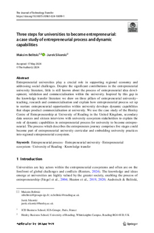 Belitski, M. orcid id iconORCID: https://orcid.org/0000-0002-9895-0105 and Sikorski, J. (2024) Three steps for universities to become entrepreneurial: a case study of entrepreneurial process and dynamic capabilities. The Journal of Technology Transfer. ISSN 0892-9912 doi: 10.1007/s10961-024-10099-1