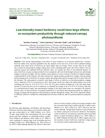 Low-intensity insect herbivory could have large effects on ecosystem productivity through reduced canopy photosynthesis.