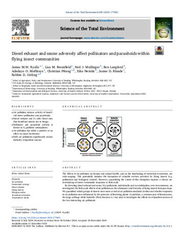 Diesel exhaust and ozone adversely affect pollinators and parasitoids within flying insect communities.