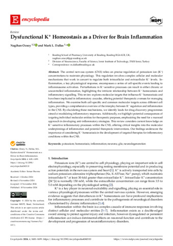 Ozsoy, N. orcid id iconORCID: https://orcid.org/0000-0001-6269-9484 and Dallas, M. L. orcid id iconORCID: https://orcid.org/0000-0002-5190-0522 (2024) Dysfunctional K+ homeostasis as a driver for brain inflammation. Encyclopedia, 4 (4). pp. 1681-1699. ISSN 2673-8392 doi: 10.3390/encyclopedia4040110