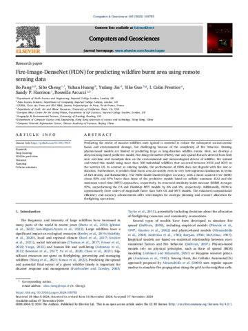 Pang, B., Cheng, S., Huang, Y., Jin, Y., Guo, Y., Prentice, I. C., Harrison, S. P. orcid id iconORCID: https://orcid.org/0000-0001-5687-1903 and Arcucci, R. (2025) Fire-Image-DenseNet (FIDN) for predicting wildfire burnt area using remote sensing data. Computers & Geosciences, 195. 105783. ISSN 1873-7803 doi: 10.1016/j.cageo.2024.105783