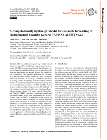 Black, E. orcid id iconORCID: https://orcid.org/0000-0003-1344-6186, Ellis, J. and Maidment, R. I. orcid id iconORCID: https://orcid.org/0000-0003-2054-3259 (2024) A computationally lightweight model for ensemble forecasting of environmental hazards: General TAMSAT-ALERT v1.2.1. Geoscientific Model Development, 17 (22). pp. 8353-8372. ISSN 1991-9603 doi: 10.5194/gmd-17-8353-2024