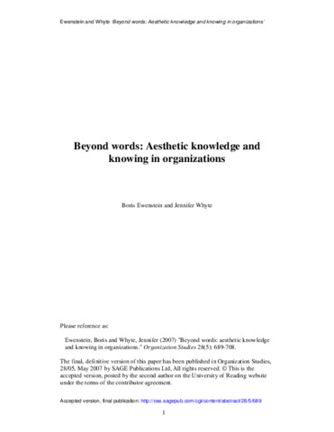 Ewenstein, B. and Whyte, J. (2007) Beyond words: Aesthetic knowledge and knowing in design. Organization Studies, 28 (5). pp. 689-708. ISSN 0170-8406 doi: 10.1177/0170840607078080