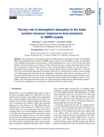 The key role of atmospheric absorption in the Asian summer monsoon response to dust emissions in CMIP6 models.
