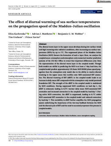 The effect of diurnal warming of sea‐surface temperatures on the propagation speed of the Madden–Julian oscillation.