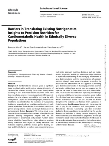 Barriers in translating existing nutrigenetics insights to precision nutrition for cardiometabolic health in ethnically diverse populations.