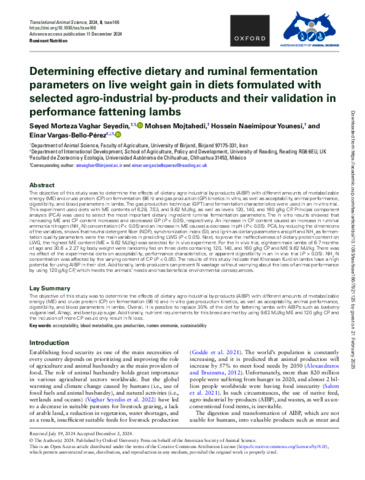 Determining effective dietary and ruminal fermentation parameters on live weight gain in diets formulated with selected agro-industrial by-products and their validation in performance fattening lambs