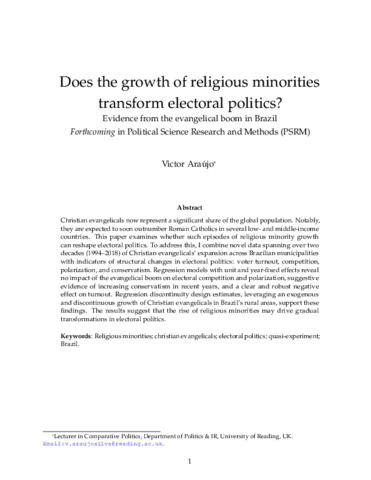 Christian evangelicals now represent a significant share of the global population. Notably, they are expected to soon outnumber Roman Catholics in several low- and middle-income countries. This paper examines whether such episodes of religious minority growth can reshape electoral politics. To address this, I combine novel data spanning over two decades (1994–2018) of Christian evangelicals’ expansion across Brazilian municipalities with indicators of structural changes in electoral politics: voter turnout, competition, polarization, and conservatism. Regression models with unit and year-fixed effects reveal no impact of the evangelical boom on electoral competition and polarization, suggestive evidence of increasing conservatism in recent years, and a clear and robust negative effect on turnout. Regression discontinuity design estimates, leveraging an exogenous and discontinuous growth of Christian evangelicals in Brazil’s rural areas, support these findings. The results suggest that the rise of religious minorities may drive gradual transformations in electoral politics.