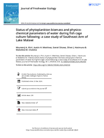 Phiri, M. A., Mtethiwa, A. H., Sikawa, D., Hasimuna, O. J. and Chatsika, M. M. (2025) Status of phytoplankton biomass and physico-chemical parameters of water during fish cage culture fallowing: a case study of Southeast Arm of Lake Malawi. Journal of Freshwater Ecology, 40 (1). 2442930. ISSN 2156-6941 doi: 10.1080/02705060.2024.2442930