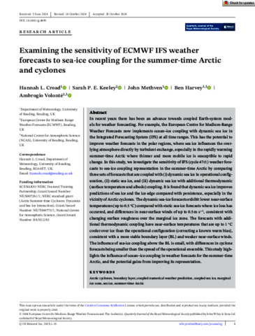 Croad, H. L. orcid id iconORCID: https://orcid.org/0000-0002-5124-4860, Keeley, S. P. E. orcid id iconORCID: https://orcid.org/0000-0002-8046-765X, Methven, J. orcid id iconORCID: https://orcid.org/0000-0002-7636-6872, Harvey, B. orcid id iconORCID: https://orcid.org/0000-0002-6510-8181 and Volonté, A. orcid id iconORCID: https://orcid.org/0000-0003-0278-952X (2024) Examining the sensitivity of ECMWF IFS weather forecasts to sea‐ice coupling for the summer‐time Arctic and cyclones. Quarterly Journal of the Royal Meteorological Society. ISSN 1477-870X doi: 10.1002/qj.4899