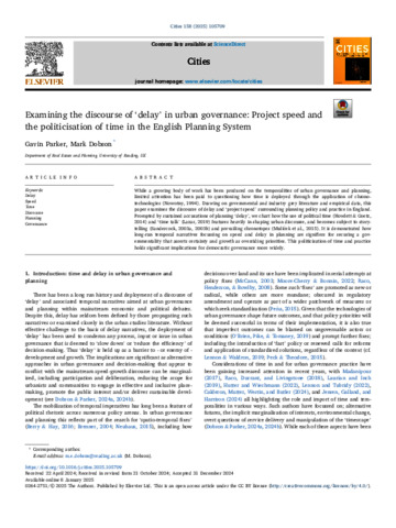 Parker, G. orcid id iconORCID: https://orcid.org/0000-0003-3079-4377 and Dobson, M. orcid id iconORCID: https://orcid.org/0000-0001-8599-9797 (2025) Examining the discourse of ‘delay’ in urban governance: project speed and the politicisation of time in the English Planning System. Cities, 158. 105709. ISSN 1873-6084 doi: 10.1016/j.cities.2025.105709