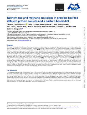 Nutrient use and methane emissions in growing beef fed different protein sources and a pasture-based diet.