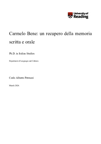 Petruzzi, C. A. (2024) Carmelo Bene: un recupero della memoria scritta e orale. PhD thesis, University of Reading. doi: 10.48683/1926.00120142