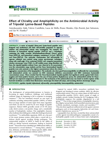 Adak, A., Castelletto, V. orcid id iconORCID: https://orcid.org/0000-0002-3705-0162, de Mello, L. orcid id iconORCID: https://orcid.org/0000-0001-7630-5087, Mendes, B., Barrett, G. orcid id iconORCID: https://orcid.org/0000-0003-1509-0179, Seitsonen, J. and Hamley, I. W. orcid id iconORCID: https://orcid.org/0000-0002-4549-0926 (2025) Effect of chirality and amphiphilicity on the antimicrobial activity of tripodal lysine-based peptides. ACS Applied Bio Materials, 8 (1). pp. 803-813. ISSN 2576-6422 doi: 10.1021/acsabm.4c01635